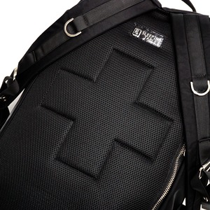 メタルバックルとアジャスターベルトの装飾が特徴的なバックパック。