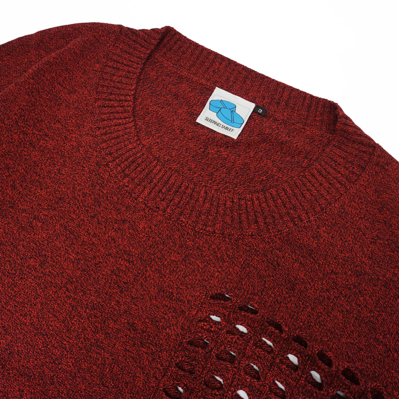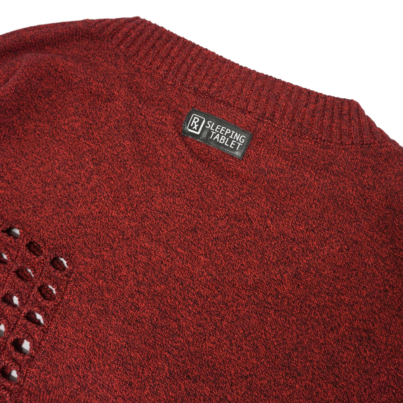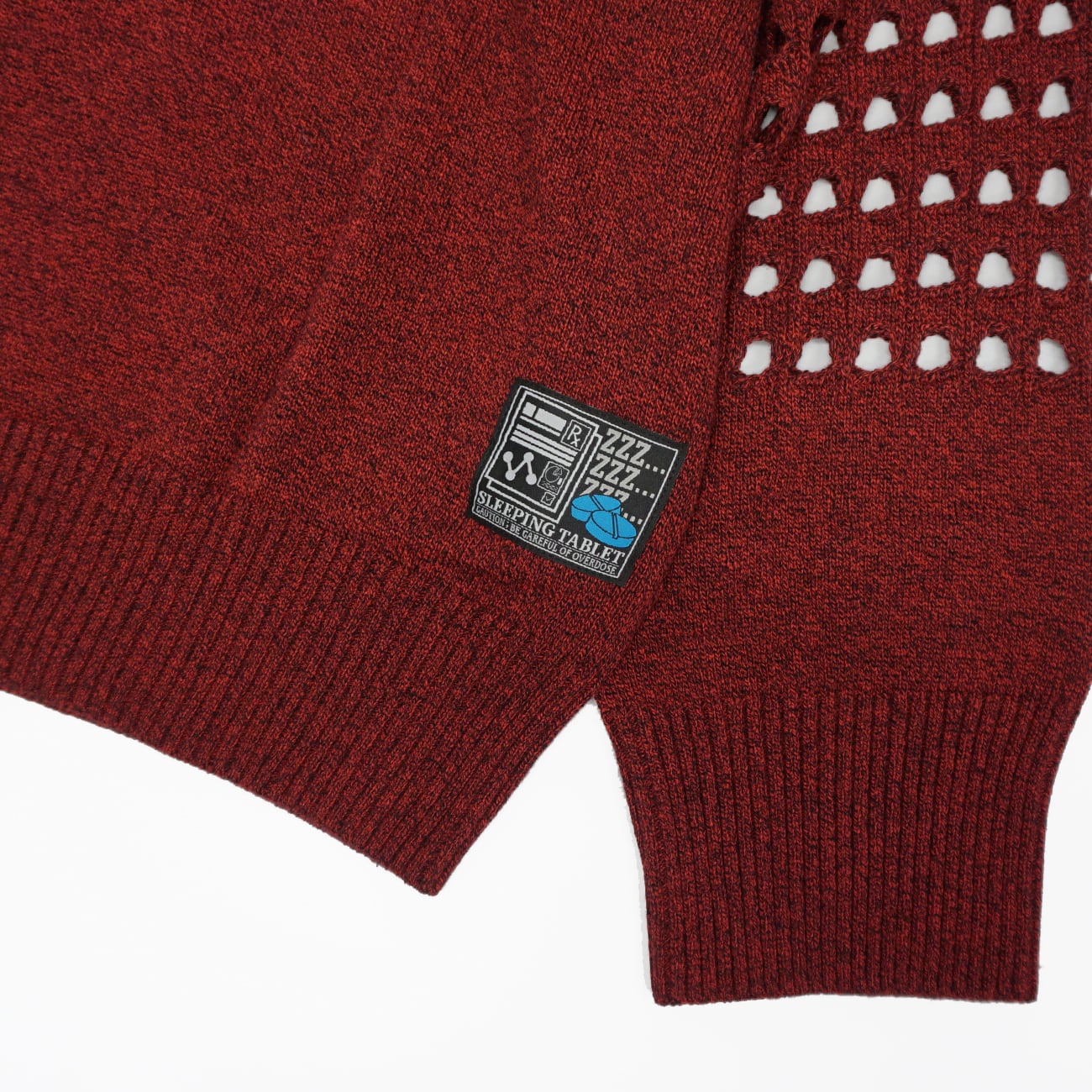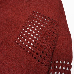 左胸と両腕に貫通するように穴の空いたディテールを加えたオリジナル機械編みニットセーター。
